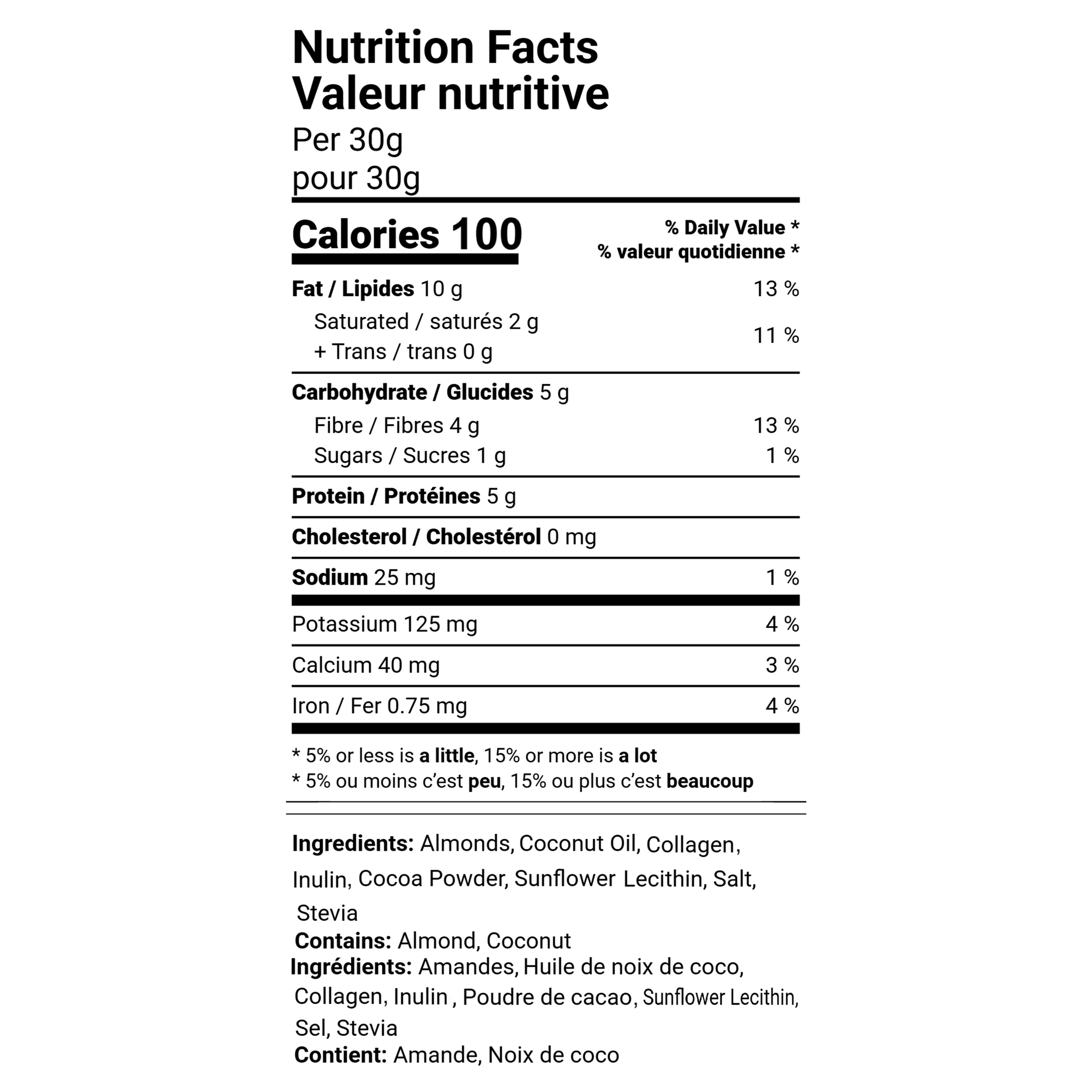 Almonds, Coconut Oil, Collagen, Inulin, Cocoa Powder, Sunflower Lecithin, Salt, Stevia.