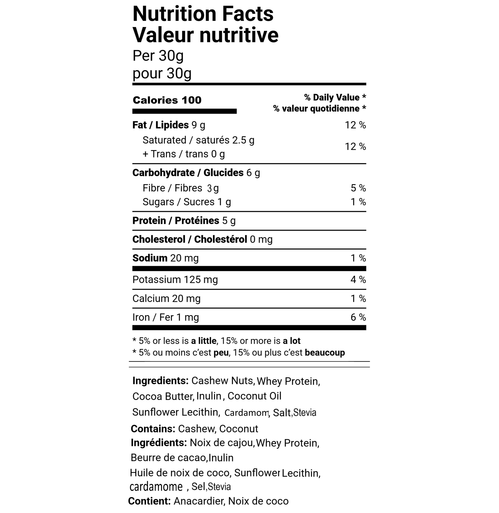 Cashew Nuts, Whey Protein, Cocoa Butter, Inulin, Coconut Oil, Sunflower Lecithin, Cardamom, Salt, Stevia.