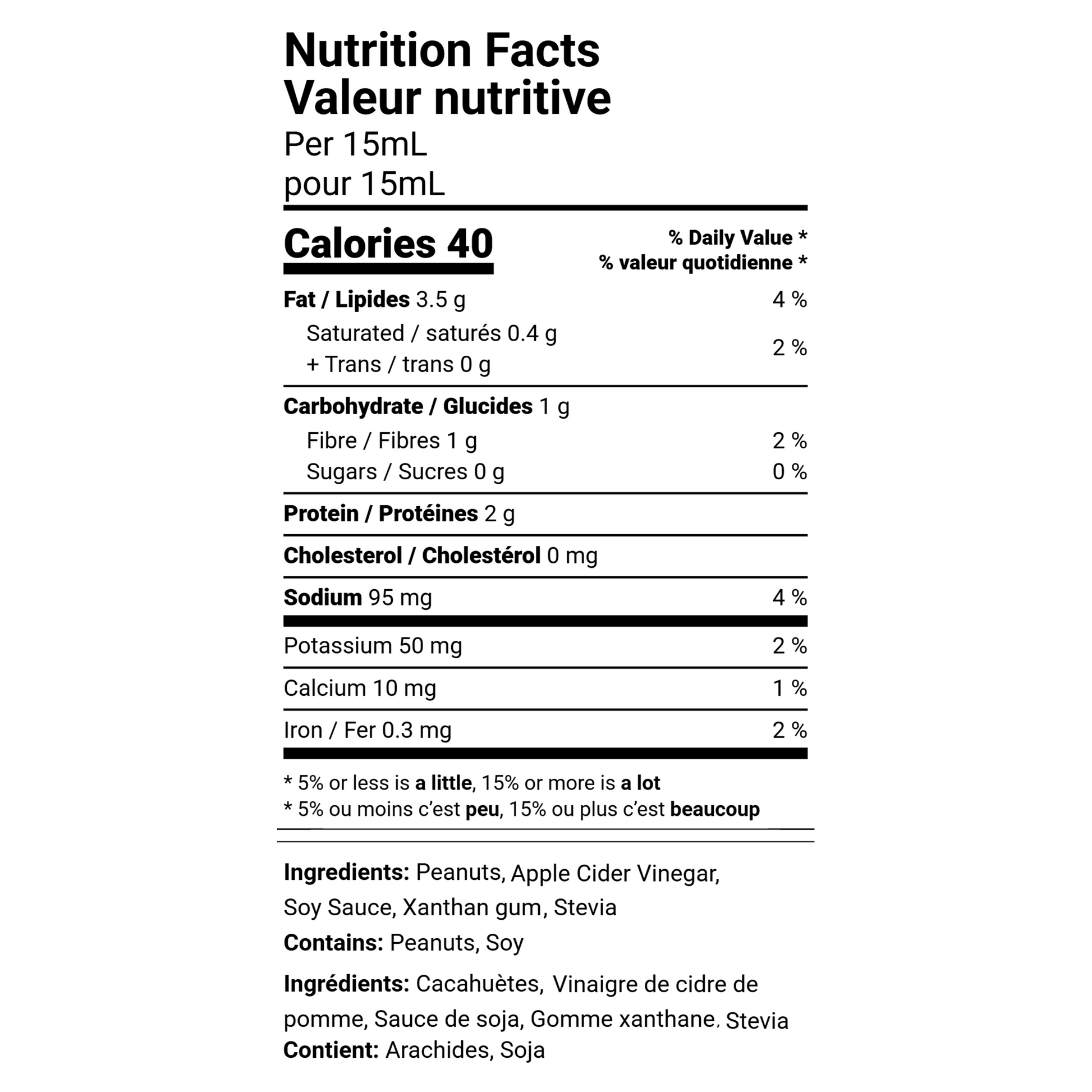 Peanuts, Apple Cider Vinegar, Soy Sauce, Xanthan Gum, Stevia.