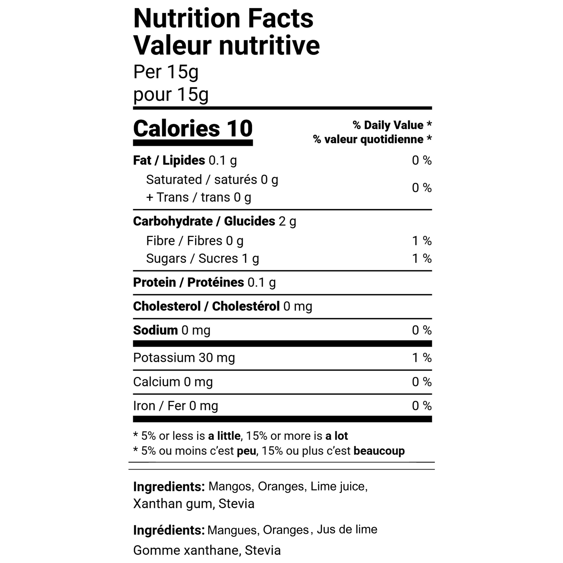 Mangos, Oranges, Lime Juice, Xanthan Gum, Stevia.