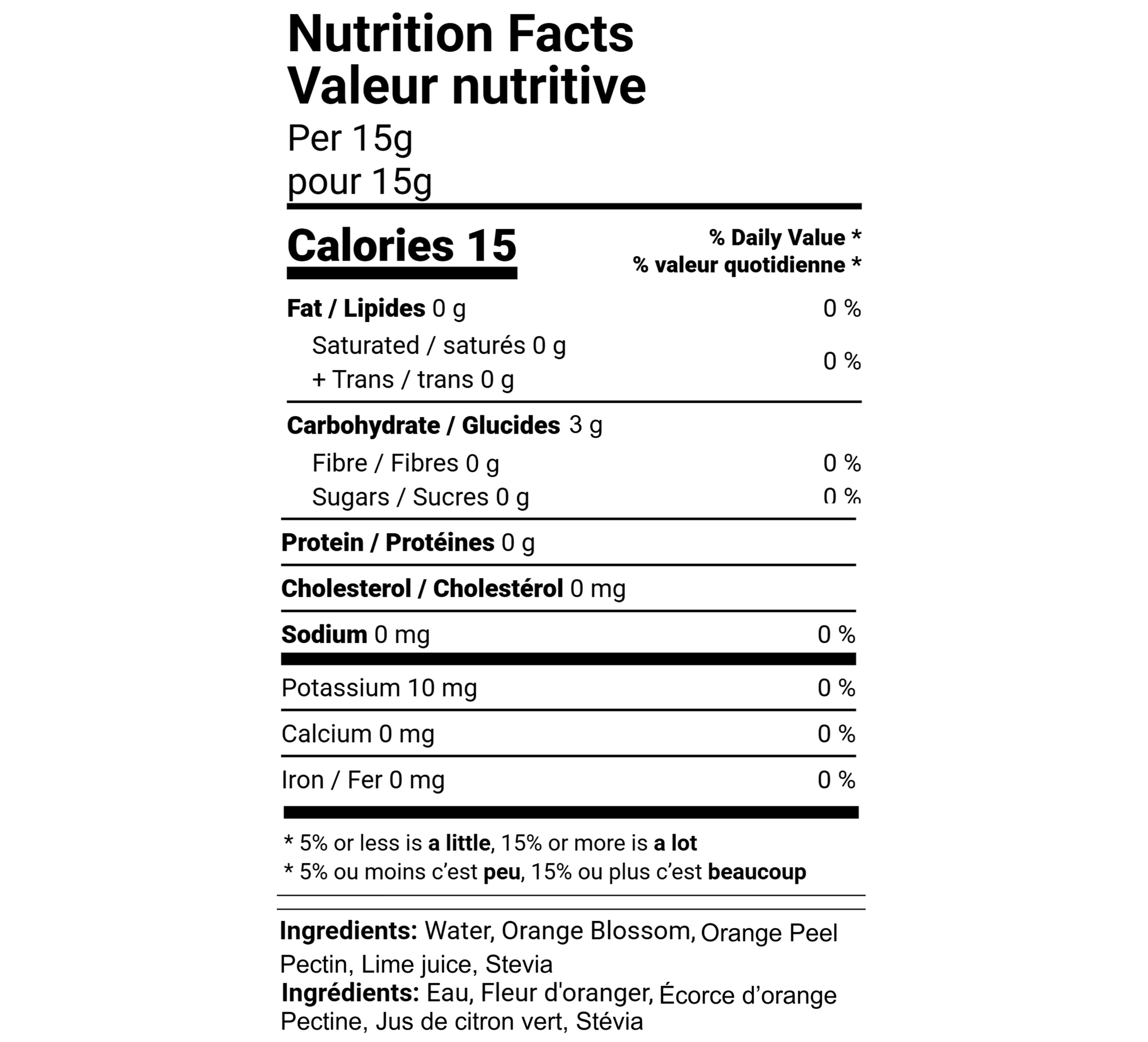 Water, Orange Blossom, Orange Peel, Pectin, Lime Juice, Stevia.