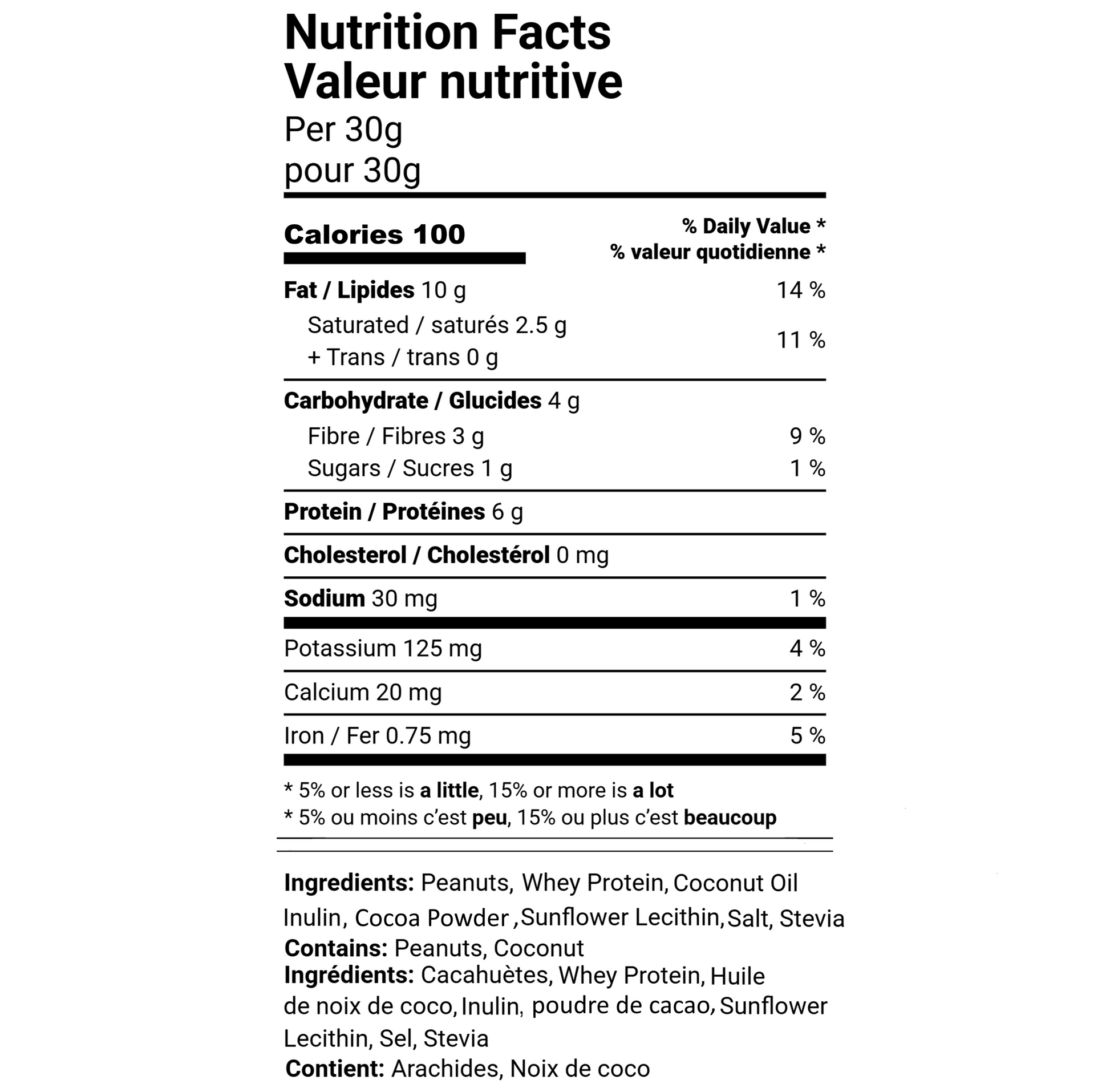 Peanuts, Whey Protein, Cocoa Powder, Coconut Oil, Inulin, Sunflower Lecithin, Salt, Stevia.