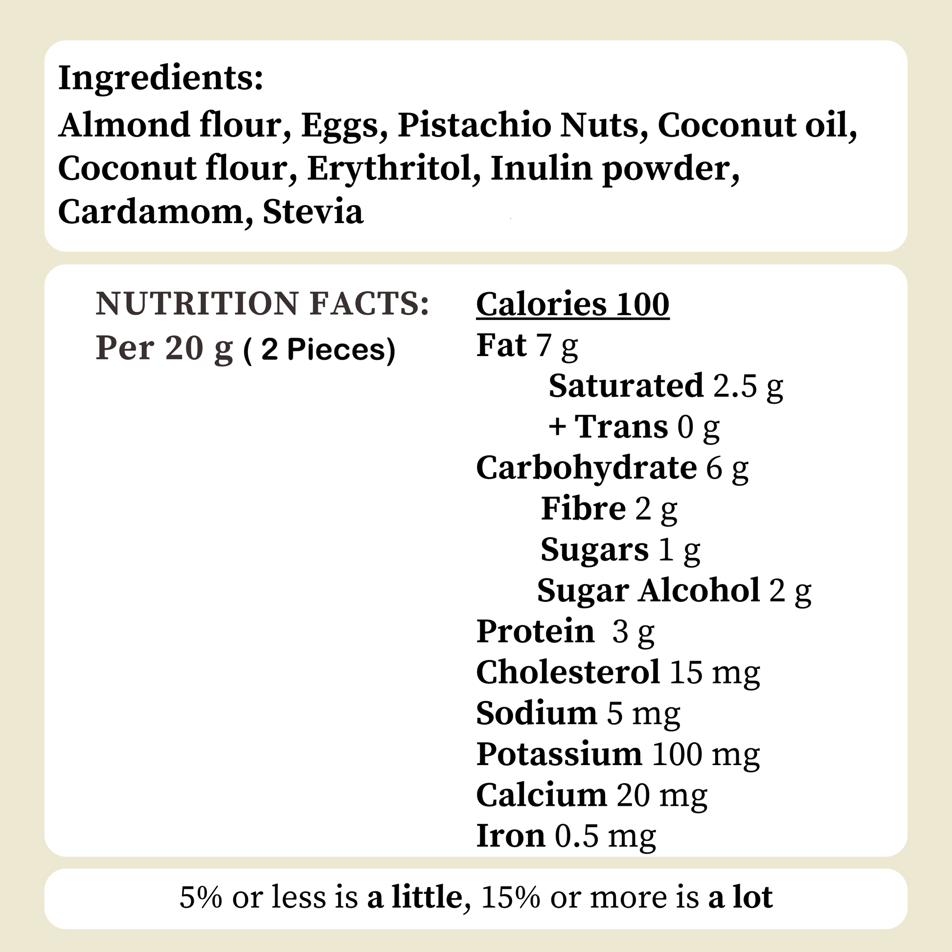 Almond Flour, Pistachios, Eggs, Coconut Oil, Coconut Flour, Erythritol, Inulin Powder, Cardamom, Pectin, Citric Acid, Stevia