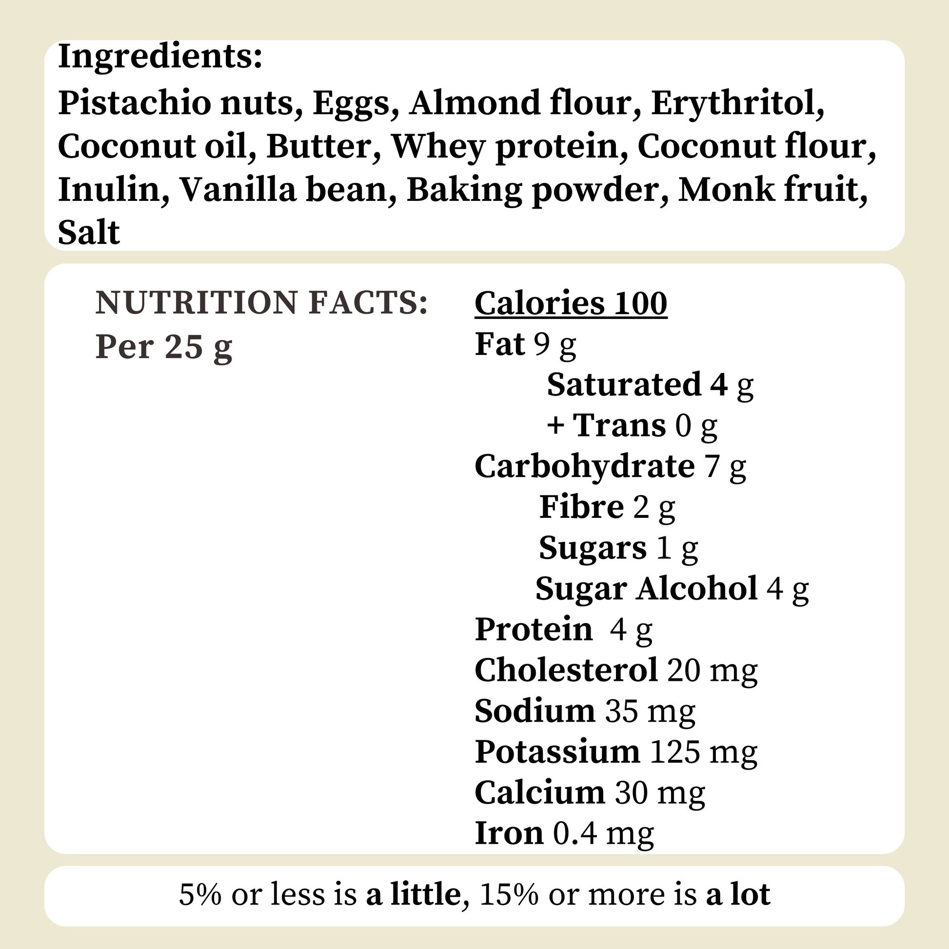 Pistachio Nuts, Eggs, Almond Flour, Erythritol, Coconut Oil, Butter, Whey Protein,
